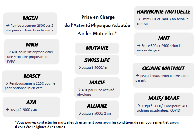 Certaines mutuelles santé ont pris le parti de prendre en charge le sport sur ordonnance pour leurs adhérents souffrant d’affection longue durée. Ainsi le programme d’activité physique prescrit aux patients est pris en charge partiellement voire totalement dans certains cas. Les montants remboursés sont en effet très variables selon les mutuelles.
